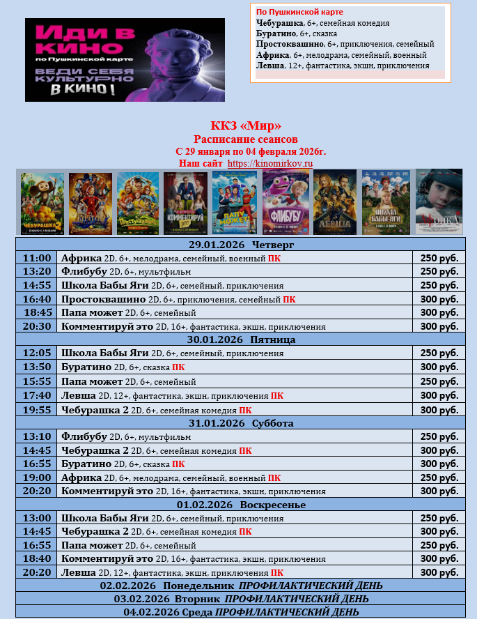 ККЗ «Мир» Расписание сеансов с 29 января по 4 февраля 2026г.